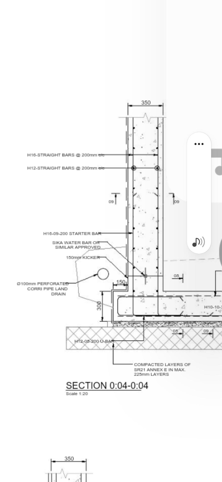 This was the design for two sides of a 2 million euro house buried into the side of a soil mound. Effectively an L-shaped retaining wall. The sides were rising from 3 metres at the tips of the wall to 7 metres at the corner. But the steel was only detailed for a 3 metre high wall. This detail would not be able to hold back 7 metres of loose soil.